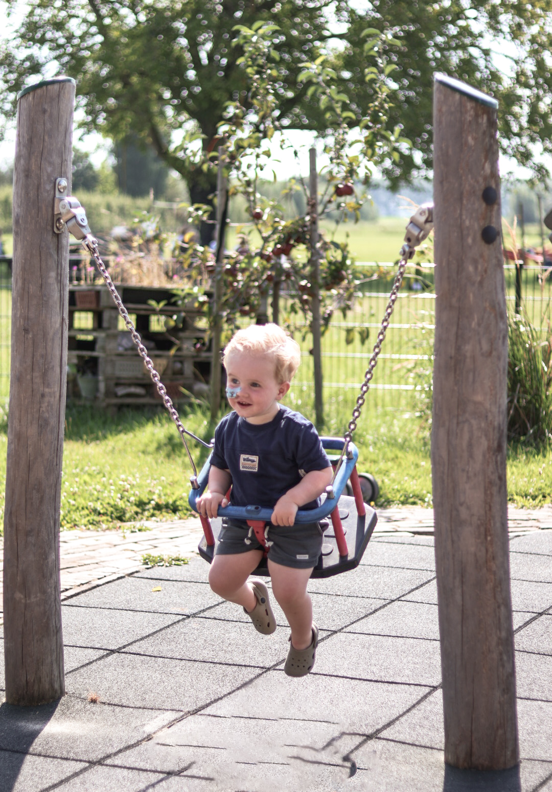 Vaste rituelen, ritme en regels zorgen ervoor dat kinderen zich zeker voelen. Vanuit een veilige basis durven en kunnen zij de wereld te ontdekken. Letterlijk de wijde wereld in. Vanuit de groepsruimte kijk je het weiland in naar onze gigantische Notenboom.